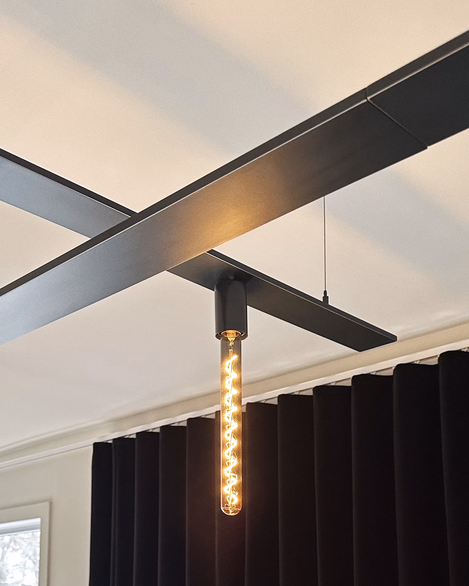 Dans cette rénovation résidentielle, nous avons suspendu trois rails en aluminium, totalisant 84 pieds linéaires, transformant la lumière en élément architectural central. Chaque faisceau a été positionné pour sculpter l’espace, guider le regard et créer des ambiances variées dans cette grande pièce ouverte.