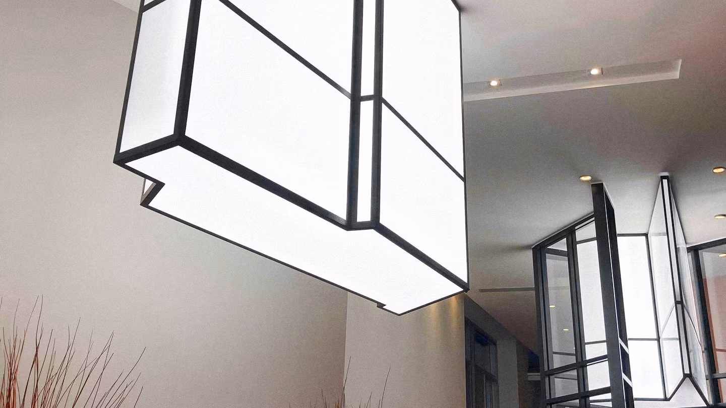 Dans le cadre de ce projet, nous avons conçu et fabriqué trois boîtes lumineuses sur mesure pour le lobby d’un immeuble résidentiel. Ces luminaires massifs imposent une présence forte et rassurante, parfaitement adaptée à un hall aux plafonds très hauts.